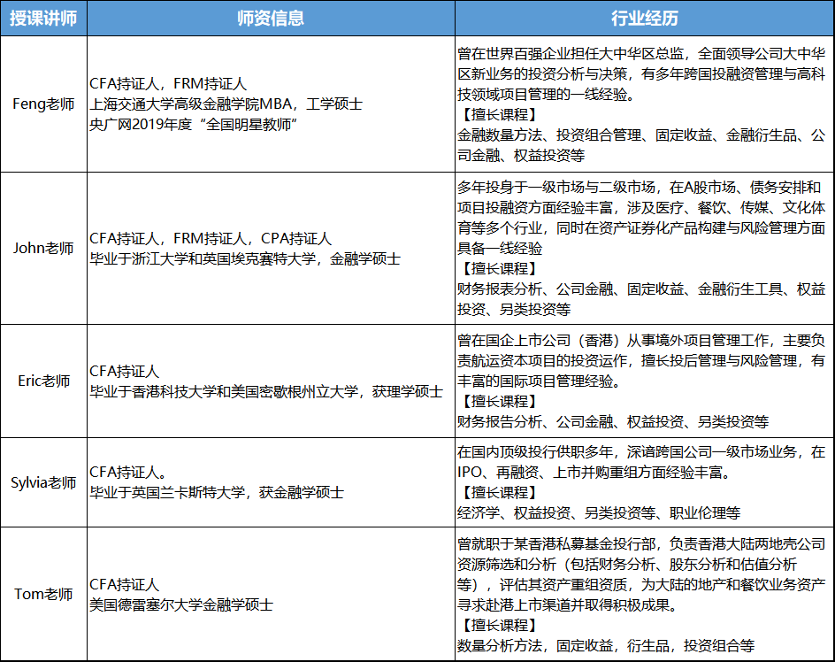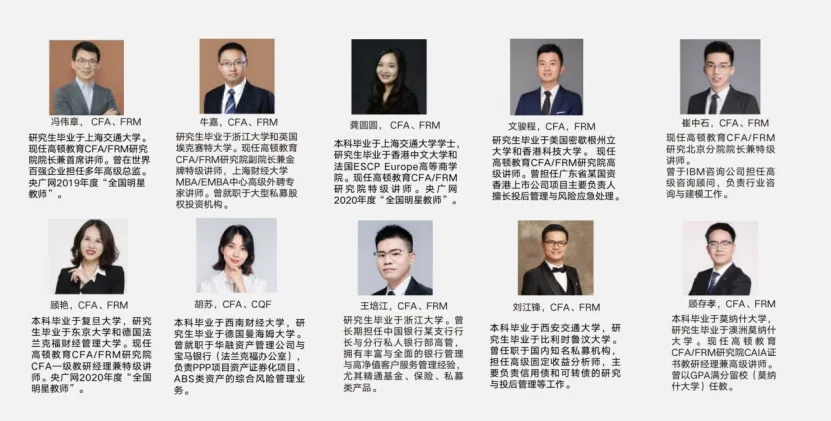 CFA菁英班师资团队全部由行业顶尖人才和中外名校毕业生组成,从事CFA教学研工作长达多年,对于教学工作具有丰厚经验。CFA菁英班全体师资均合作知名企业高顿教育集团,其为我院开展培优计划CFA菁英班的唯一合作伙伴。