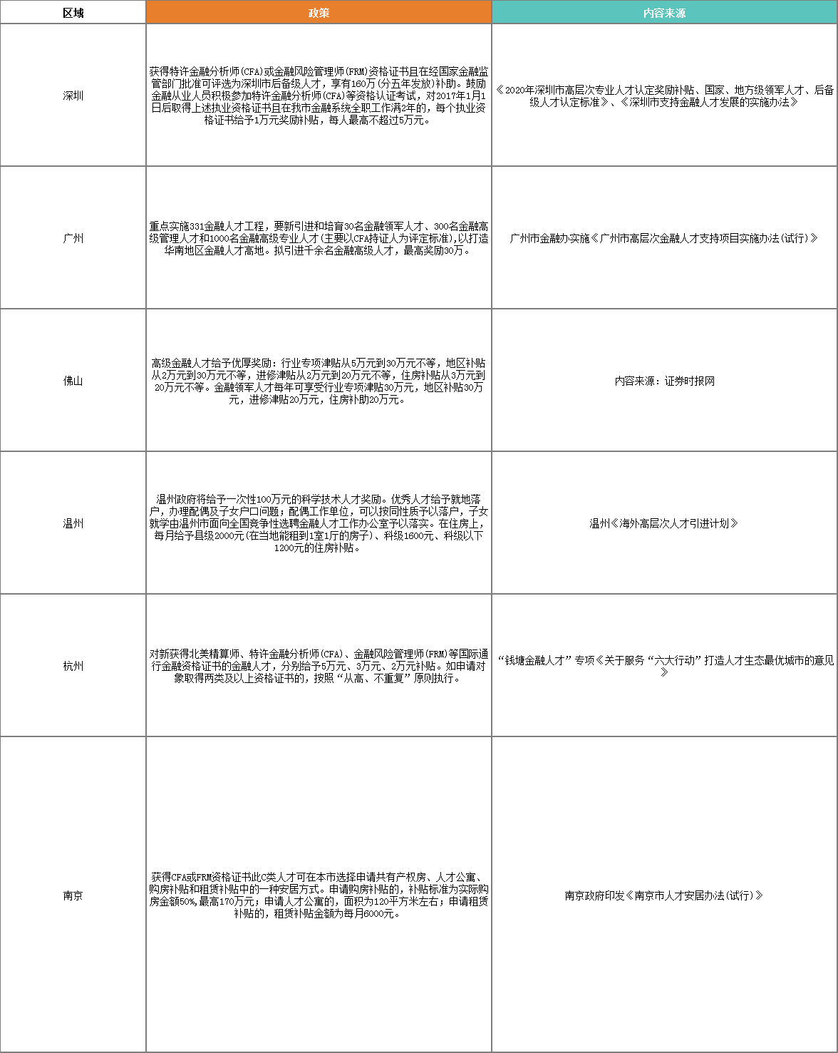 在中国内地,北京、上海、广州、深圳等20余省市地方政府已经发布了针对CFA持证人的人才吸引或支持政策。给予满足条件的持证人积分落户、个税减免、现金奖励、安家补贴等政策福利。以下是部分省市出台的CFA福利政策: