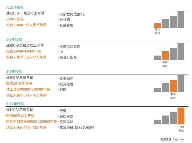 根据Pay scale官方数据,通过CFA一级无工作经验的毕业生起薪约合1.1万元以上,远超普通毕业生薪资水平;通过CFA二级及以上考试,具备1-3年工作经验,薪资约合30万-37万年薪;通过CFA三级考试且有3年工作经验以上薪资可达60万以上年薪。随着CFA学员工作经验的积累和工作能力的提升,将获得更多的晋升机会和发展空间,薪资水平也会相应提高。