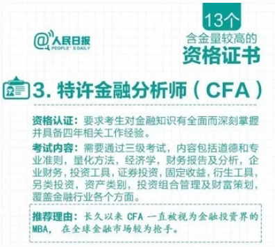 特许金融分析师(Chartered Financial Analyst,简称CFA),是由美国投资管理与研究协会(AIMR,现更名为CFA协会)于1963年开始设立的特许金融分析师职业资格认证。CFA证书是全球投资业里最为严格与含金量最高的资格认证之一,被誉为“全球金融第一考”和“华尔街的入场券”。学生凭CFA证书可应聘投行、证券公司、基金、外企、上市公司、金融机构、世界500强等企业,从事国际高级金融分析、投资与管理工作。CFA持证人在全球范围内享有广泛的职业认可和发展机会。