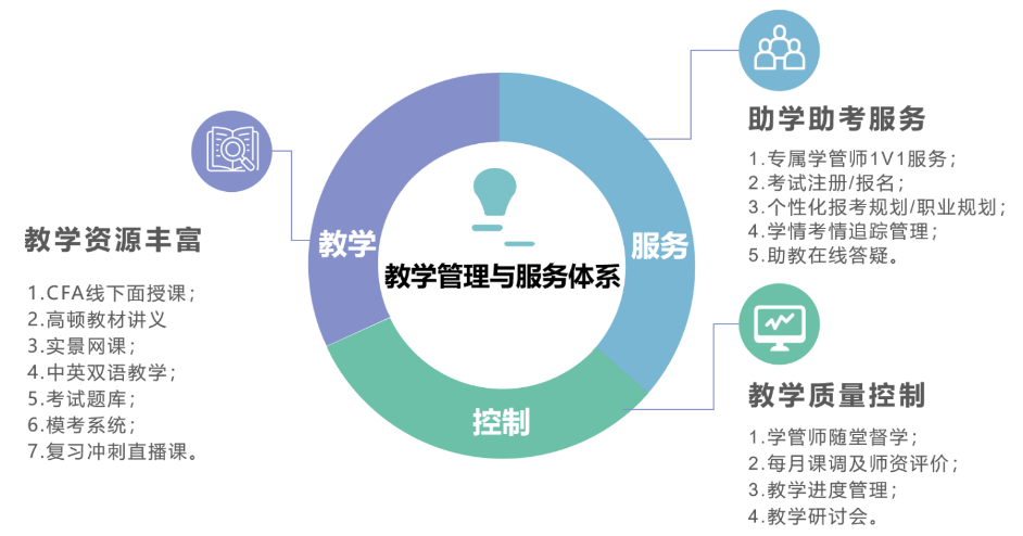3. 教学质量控制:通过教学研讨会、每月课调、学管督学等措施严格把控教学质量,帮助学生高效完成各阶段学习任务,为CFA考试打下坚实基础。此外,提供大学生职业生涯规划服务,助力学生升学及高质量就业。
